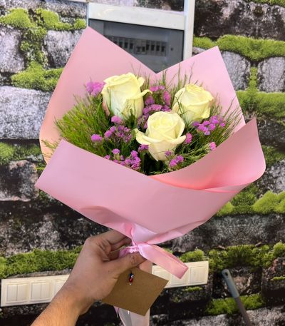💐 3 Beyaz Gül & Pembe Cipso Buketi 💕