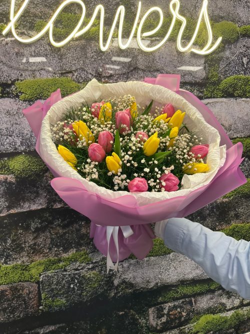 10 adet sarı ve 10 adet pembe laleden oluşan bu göz alıcı buket, tazelik ve enerjiyi bir arada sunar. 🌸 Pembe zarım stili ambalajıyla modern, zarif ve canlı bir görünüm kazanan bu özel tasarım; baharın neşesini, mutluluğunu ve sevgi dolu duyguları yansıtır. 💐