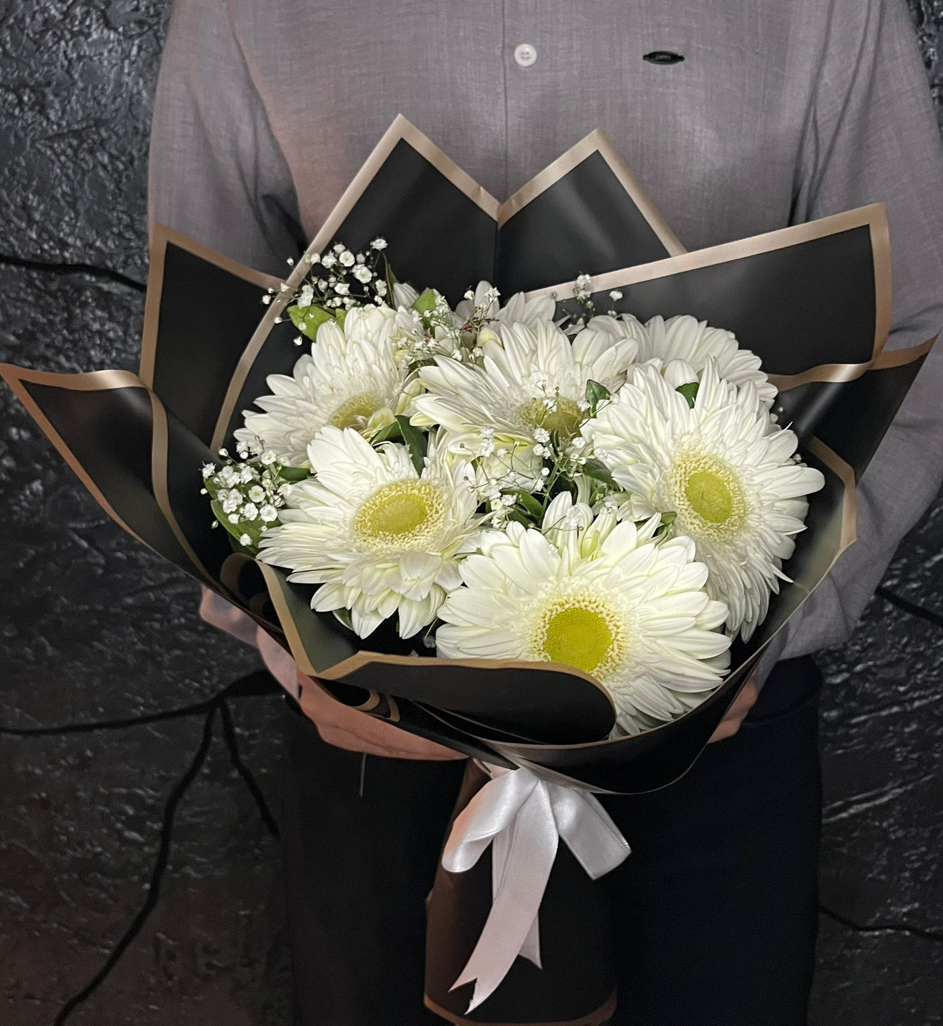 Zarif ve modern görünümüyle dikkat çeken bu orta boy buket, 8 adet taze beyaz gerberadan özenle hazırlanmıştır. 🤍