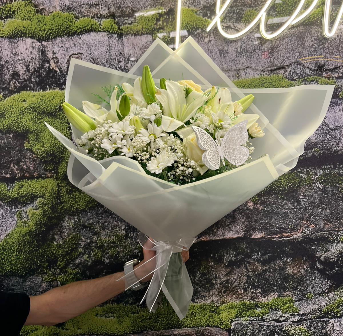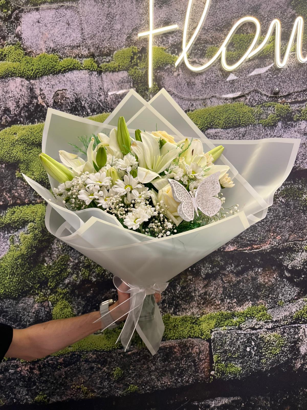 Zarafeti, sadeliği ve tazeliği bir araya getiren bu özel buket; beyaz papatyalar, beyaz lilyumlar ve cipso çiçekleri ile özenle hazırlanmıştır. İçerisindeki kelebek detayı, tasarıma romantik ve zarif bir dokunuş katar. 🤍