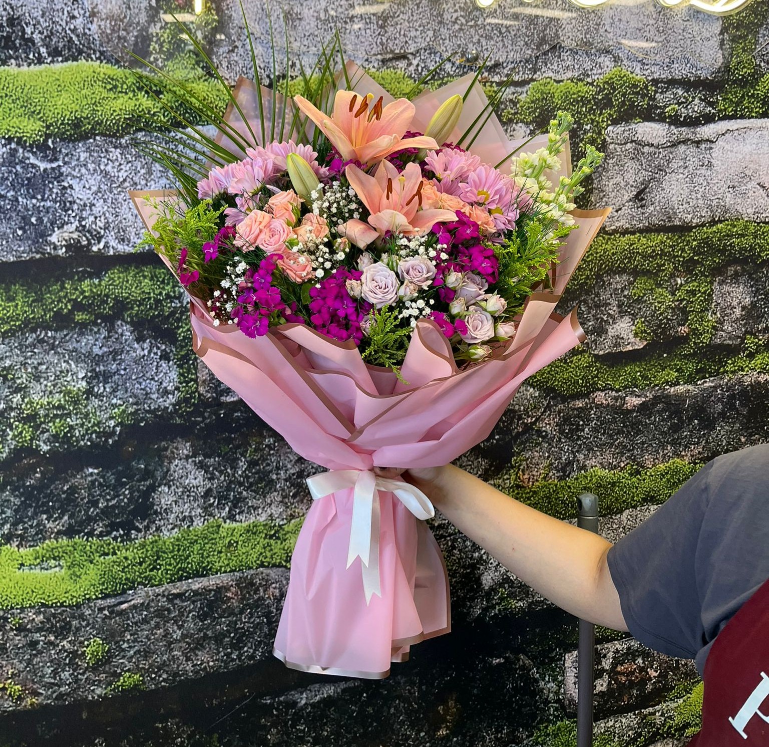 Göz kamaştıran bir tasarım! 🌷 Lila ve pembe çardak güller, romantizmin en zarif tonlarını taşırken; pembe lilyumların büyüleyici kokusu ve mor hüsnü yusuf çiçeklerinin asaleti bu bukete lüks bir hava katıyor. 🌿