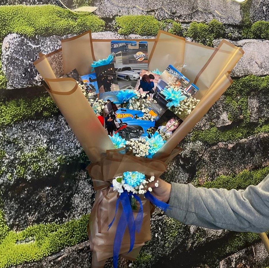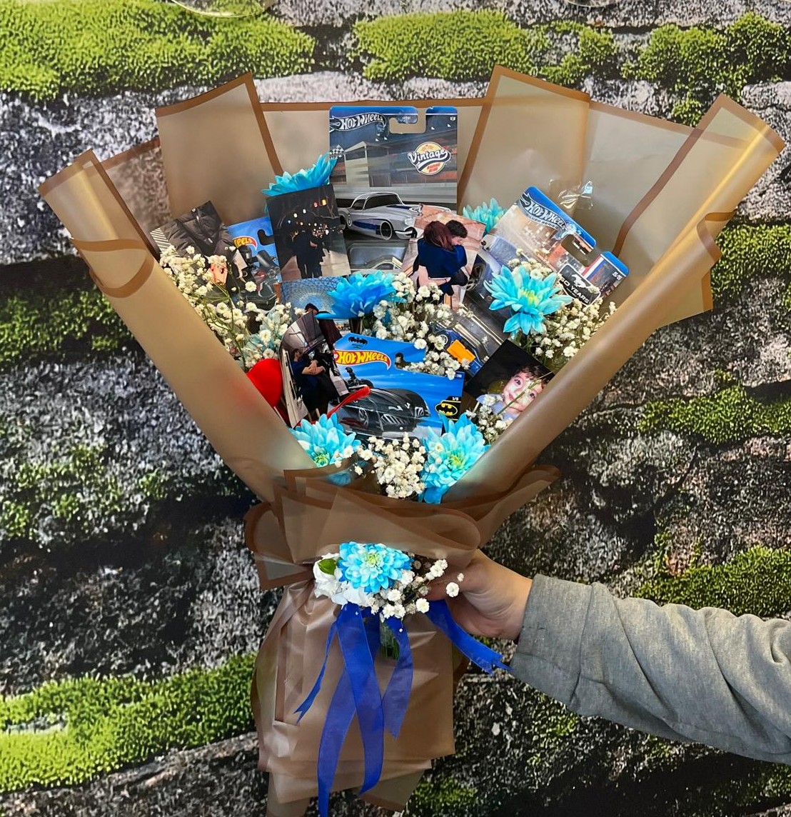 Sevdiklerinize unutulmaz ve farklı bir hediye! 6 adet Hot Wheels arabadan oluşan bu özel tasarım buket, içinde mavi krizantem (kasımpatı) çiçekleriyle şık bir şekilde hazırlanır. 🌸