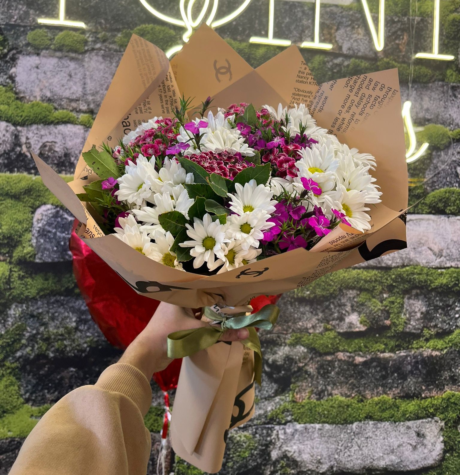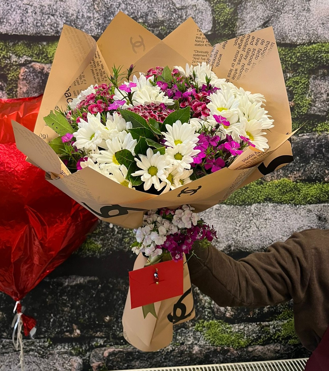 Doğallığın ve zarafetin uyumu! Beyaz papatyalar ve mor hüsnü yusuflarla hazırlanmış bu orta boy buket, soft kahverengi kağıda özenle sarılmıştır. 🌸🍃