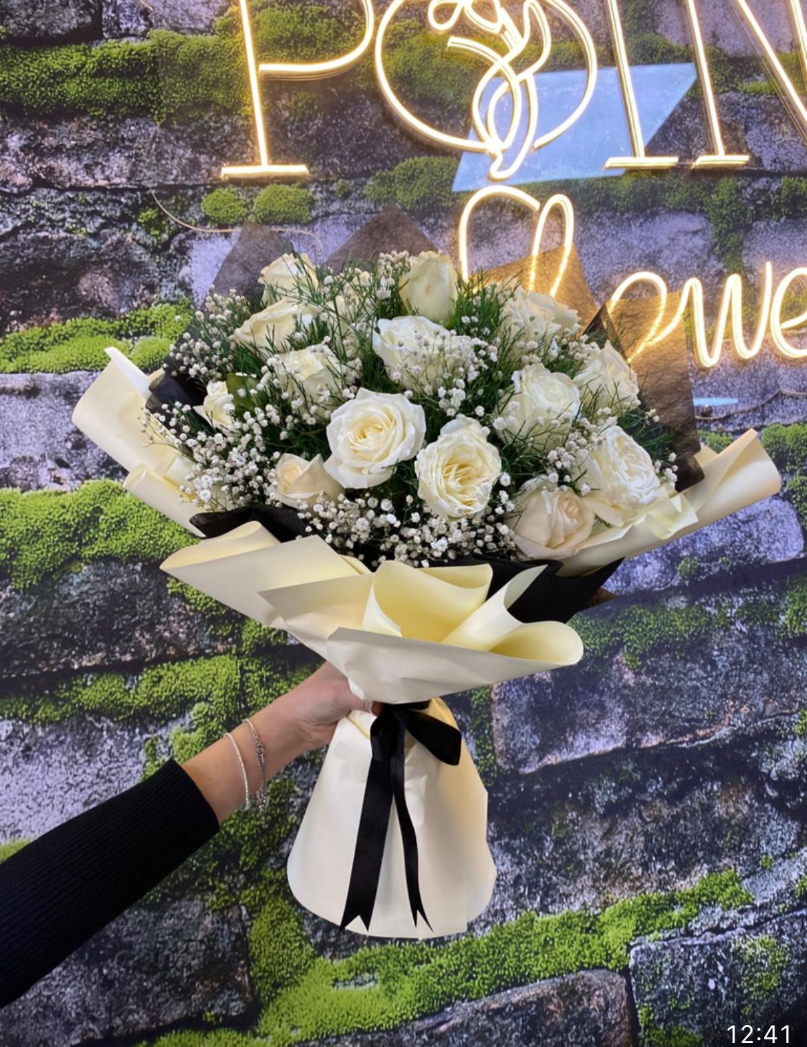Zarafetin ve saf sevginin simgesi olan bu muhteşem buket, 21 adet taze beyaz gülden özenle hazırlanmıştır. 🌸 Üçgen tasarımıyla modern bir duruş sergileyen bu özel aranjman, siyah ve krem tonlarındaki lüks ambalajı ile estetik bir görünüm sunar. 🖤✨