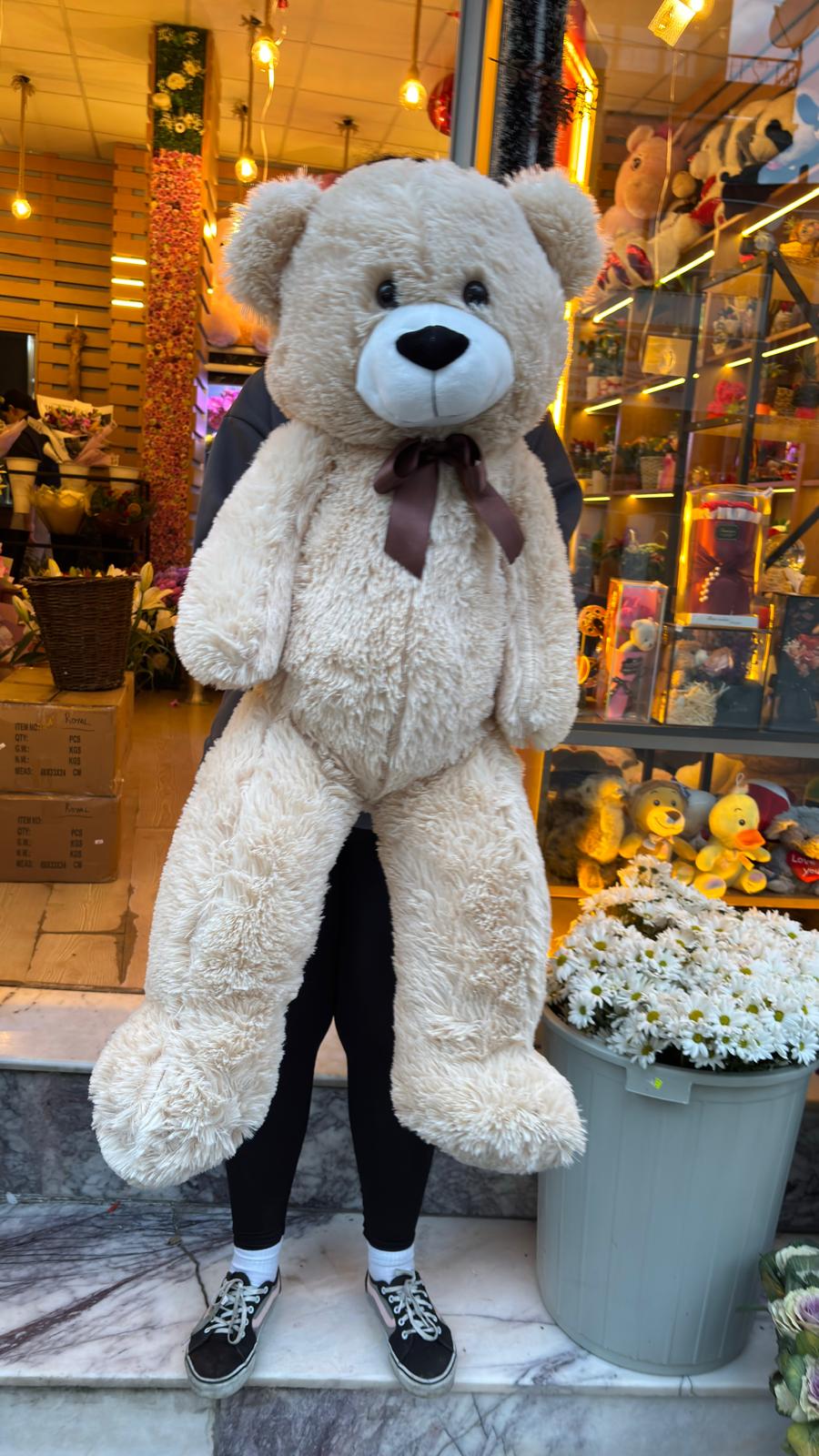 Birinci sınıf kaliteli peluş kumaştan üretilen bu dev boy ayıcık, bol dolgulu yapısı sayesinde dolgun, konforlu ve uzun süre formunu koruyan bir yapıya sahiptir 🤍 Doğum günü 🎂, Sevgililer Günü 💘, yıldönümü 💍 ve özel sürprizler için klasik ama etkileyici bir hediye seçeneğidir.