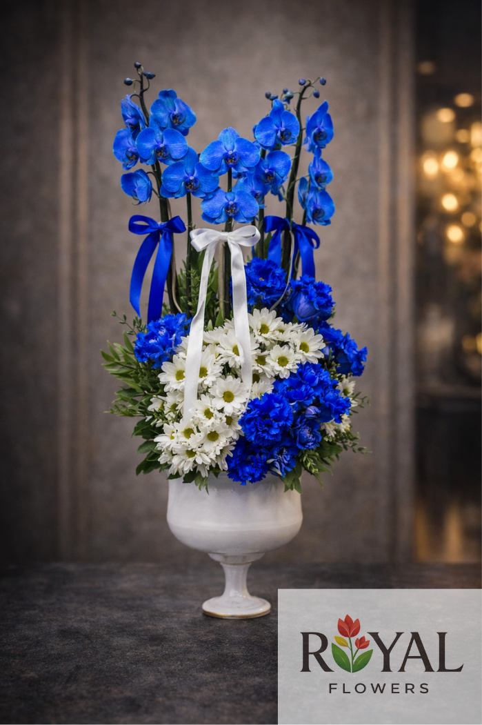 Canlı ve yoğun mavi tonlara sahip ithal orkide çiçekleri, beyaz kasımpatıların ferah ve dengeli görünümüyle birleşerek modern ve etkileyici bir tasarım oluşturur.
