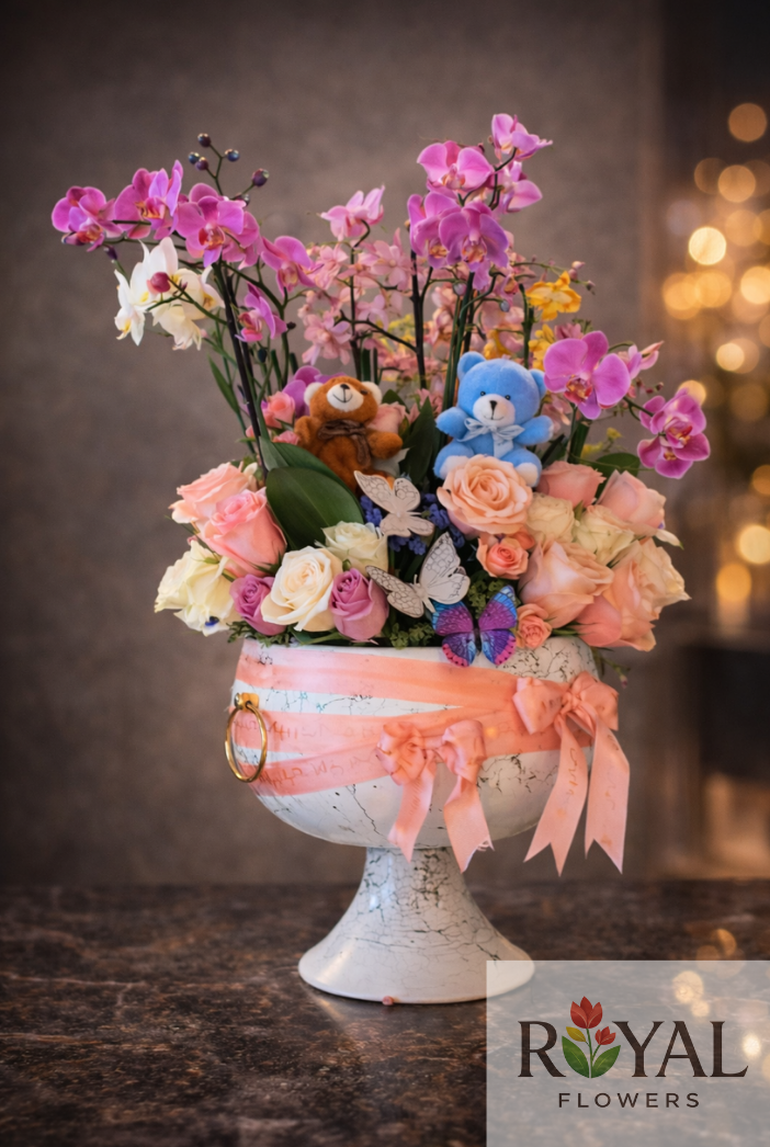 Sevimli ayıcık figürleri ve zarif detaylarla tamamlanan aranjman, özellikle doğum, yeni bebek, doğum günü ve romantik sürprizler için mükemmel bir tercih 💖
