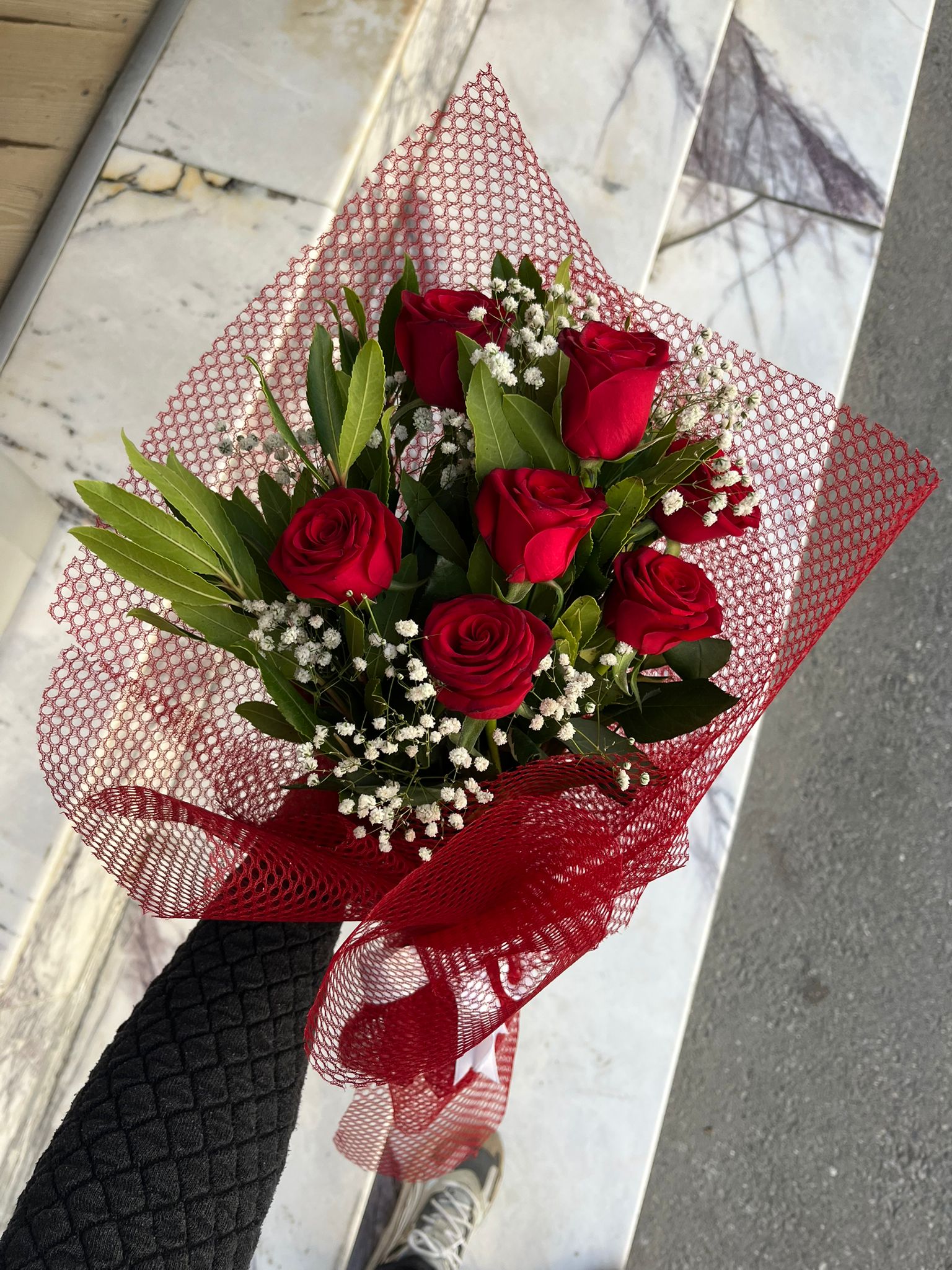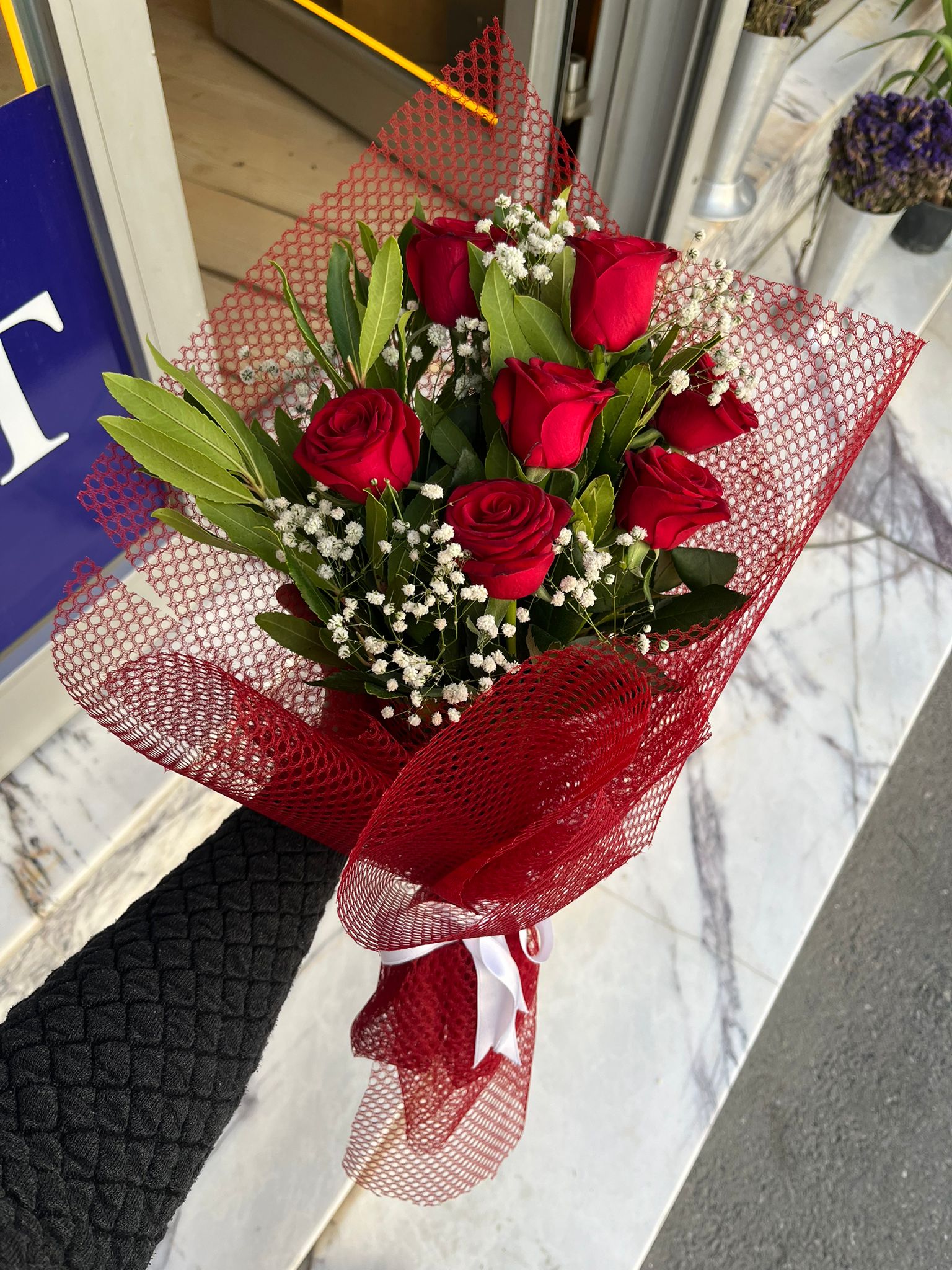 7 adet kırmızı gül buketi, zarif beyaz cipso çiçekleri ve yeşil yapraklarla harmanlanarak romantik bir dokunuşla hazırlanmıştır. Özel kırmızı ambalajı ve beyaz kurdele detayıyla sevdiklerinize unutulmaz bir sürpriz yapabilirsiniz.