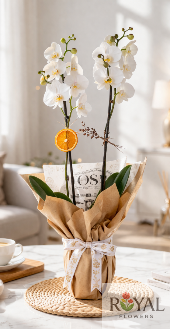 🎀 Şık ve modern kraft paketleme 🤍 Dolgun ve gösterişli çift dal orkide 🌿 Uzun ömürlü ve bakımı kolay 🏡 Ev & ofis dekorasyonuna uyumlu 🚚 Aynı gün hızlı teslimat