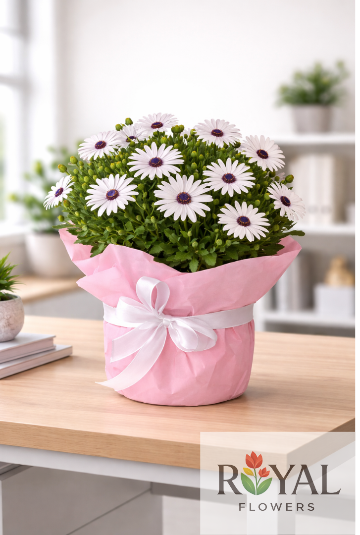 Pembe ambalajı ve zarif beyaz kurdele detayıyla hazırlanan bu şık saksı çiçeği, hem dekoratif hem de enerjik bir görünüm sunar. Özellikle masa üstü ve salon dekorasyonlarında doğal şıklık arayanlar için ideal bir tercihtir.