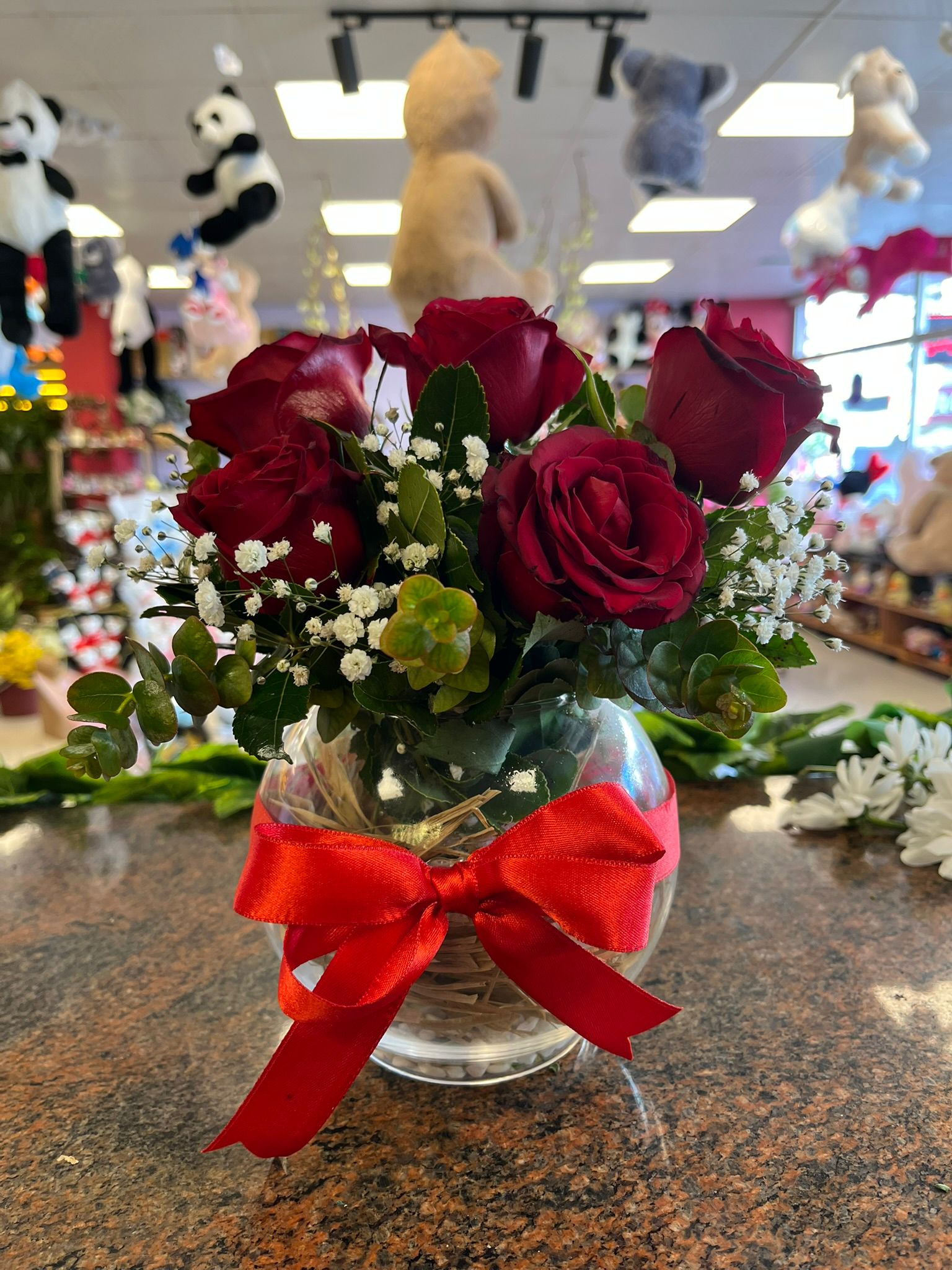 Cam Fanusta 5’Li Kırmızı Gül ve Okaliptus Aranjmanı ❤️