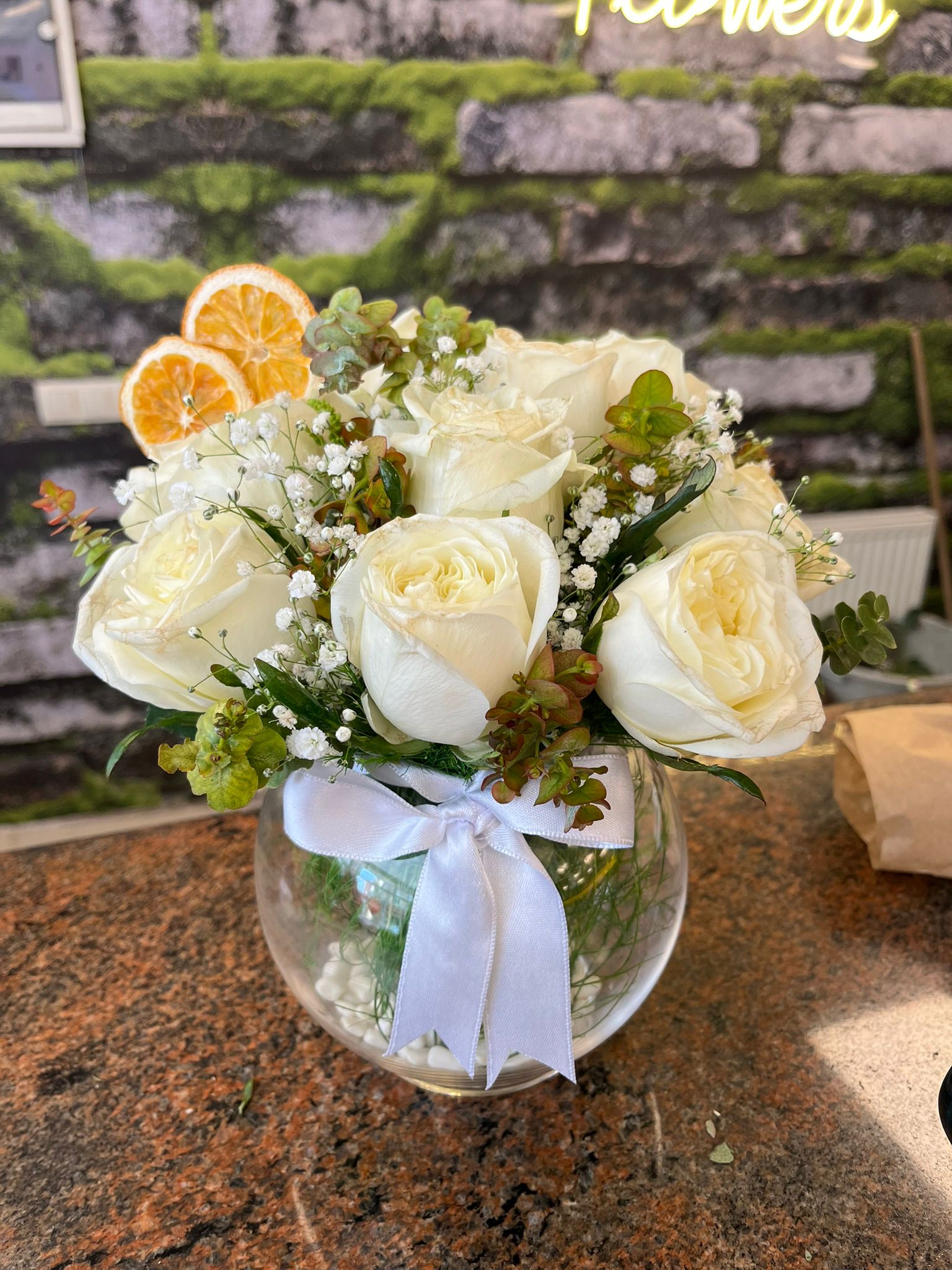 Cam fanus içerisinde 9 adet taze beyaz gül ve mis kokulu okaliptus yapraklarının buluştuğu bu zarif aranjman, sadeliğin en şık halini yansıtır. Minimal ve modern tasarımıyla her ortama uyum sağlar. Sevgi, huzur ve temizliği simgeleyen beyaz güller, doğallığın temsilcisi okaliptus ile birleşerek göz alıcı bir denge oluşturur. Sevgililer Günü, doğum günü veya özel kutlamalar için sade ama etkileyici bir hediye alternatifi sunar. 🌿