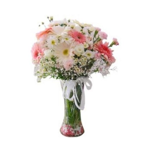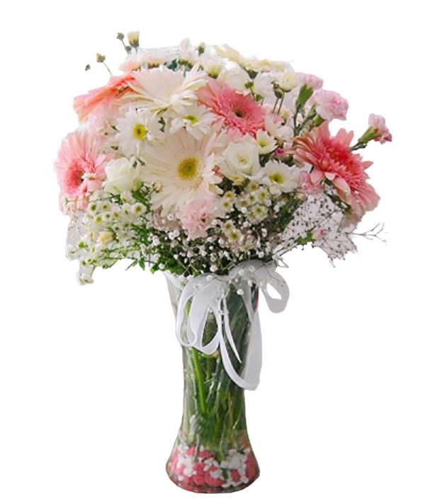 Cam Vazoda Mevsim Çiçekleri İçinde Beyaz Güller ARJ0053