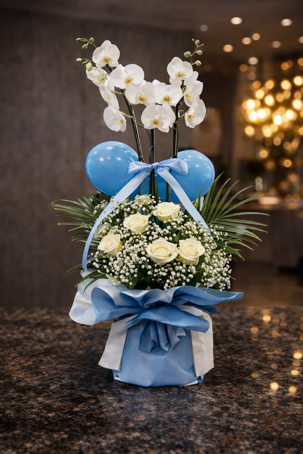 Beyaz orkidenin asil duruşu, taze beyaz güllerin zarif görünümü ve cipso çiçeklerinin doğal dokusu bir araya gelerek sade ama etkileyici bir tasarım sunar.