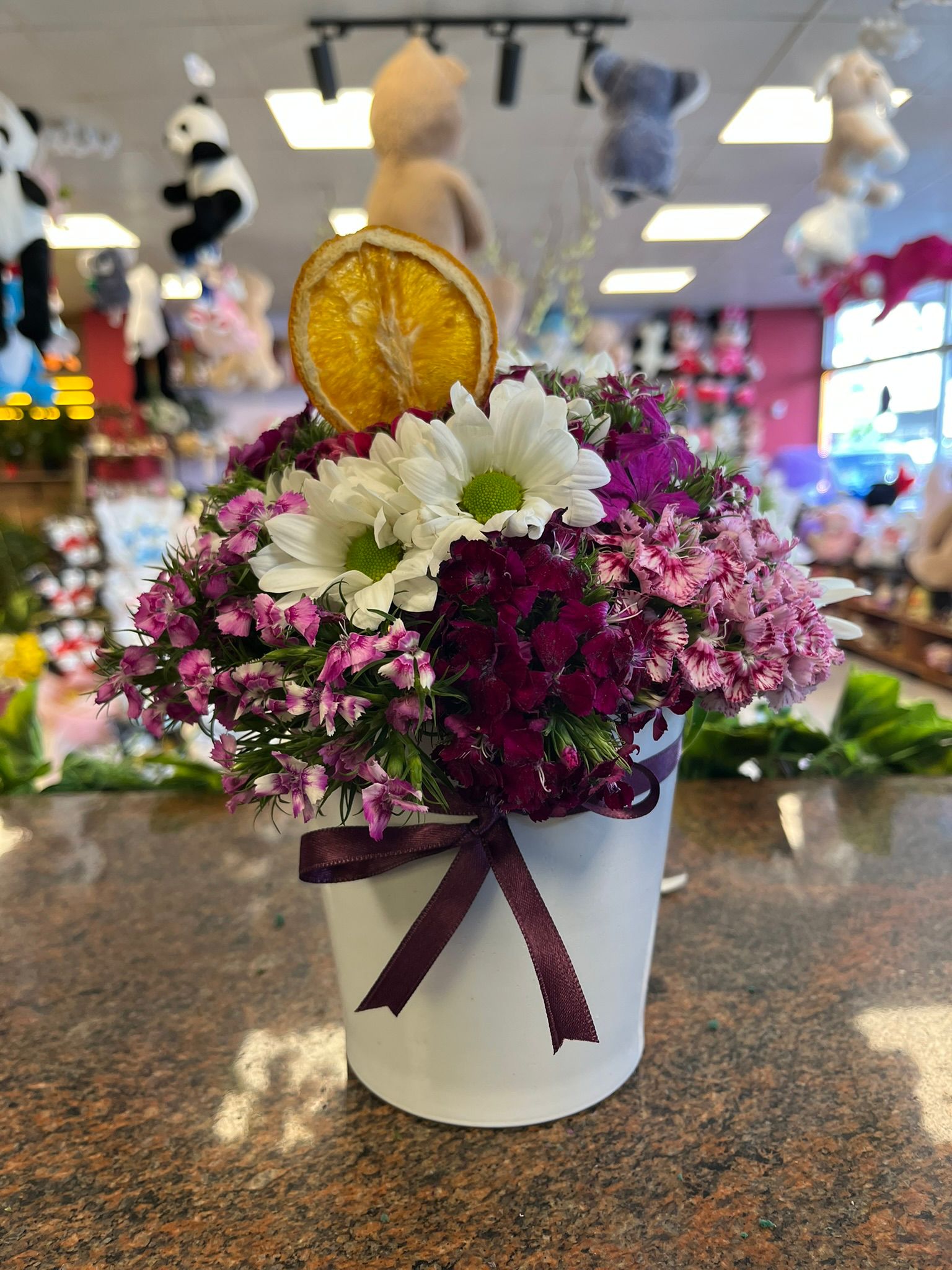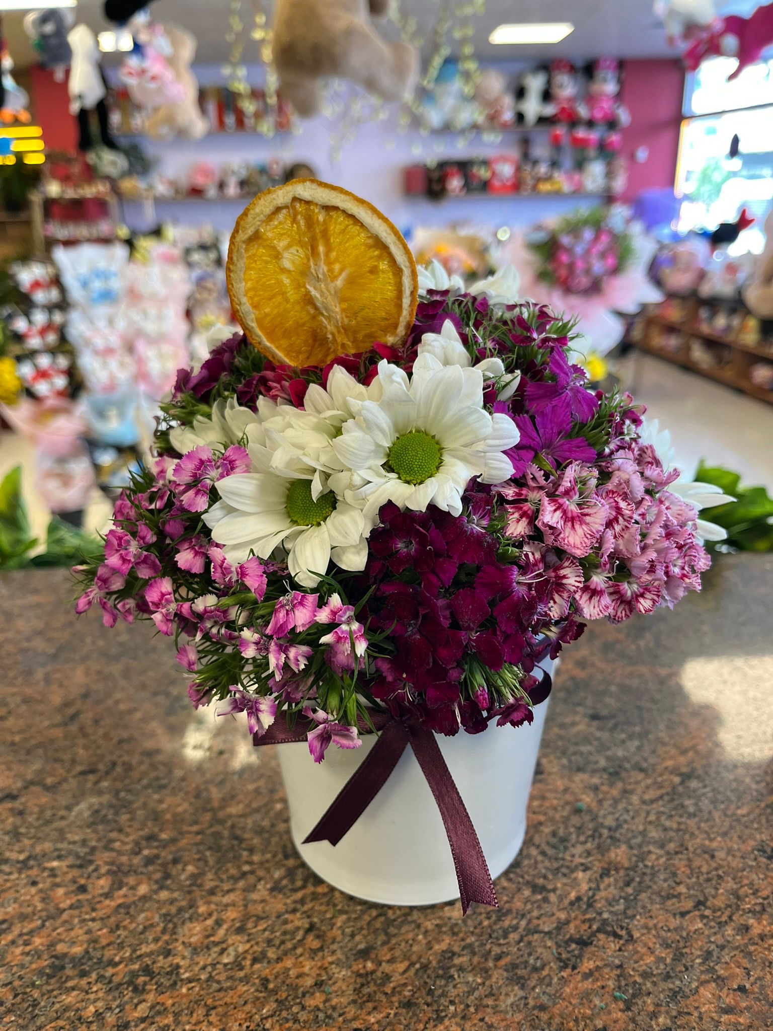 Şık seramik vazoda hazırlanmış bu zarif aranjman; renkli Hüsnü Yusuf çiçekleri ve taze beyaz papatyaların uyumuyla göz alıcı bir görünüm sunar. 🌿💐 Doğal ve iç açıcı tasarımıyla ev, ofis ya da özel gün hediyeleri için mükemmel bir tercihtir. Her detayıyla sadelik ve zarafeti bir araya getirir. ✨🤍