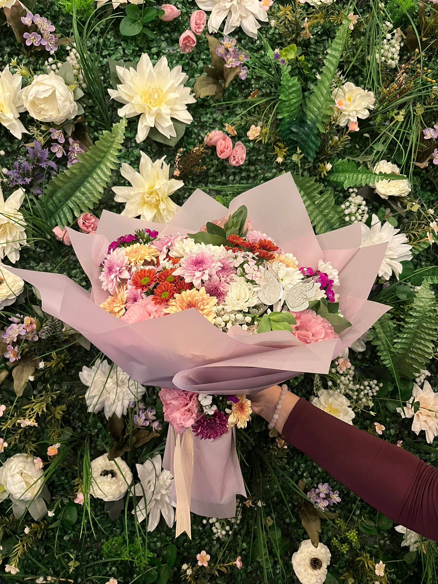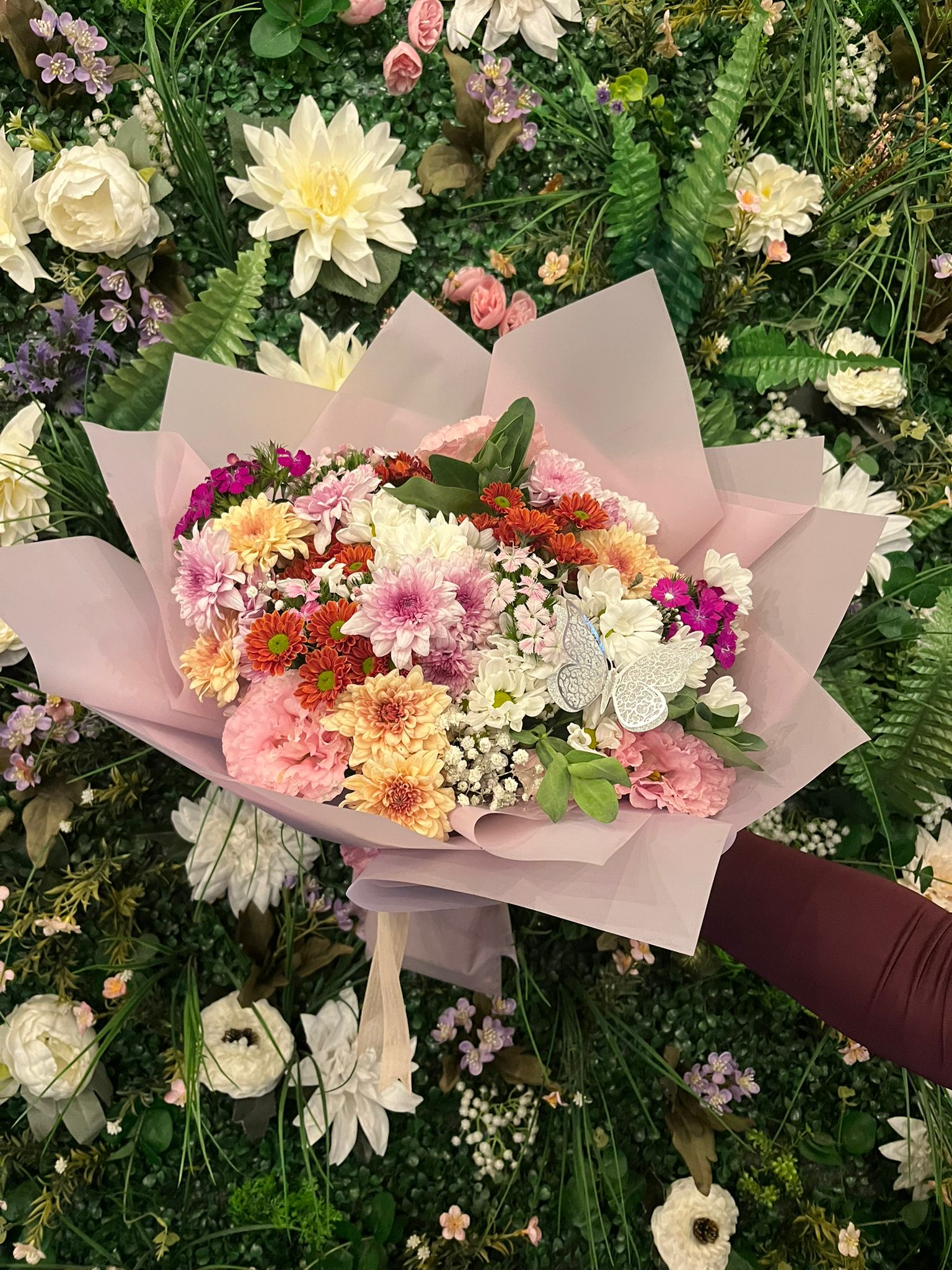 Birbirinden canlı renklerde kasımpatılar, zarif hüsnü yusuf çiçekleri ve saf beyaz papatyaların buluştuğu bu özel buket; doğallığın, neşenin ve zarafetin bir simgesidir. 🌸🦋 İçerisindeki kelebek aksesuarı, tasarıma masalsı bir hava katarak dikkat çekici bir görünüm oluşturur. Renkli ve enerjik yapısıyla hem özel günlerde hediye olarak hem de dekoratif bir aranjman olarak harika bir tercihtir. 💐✨
