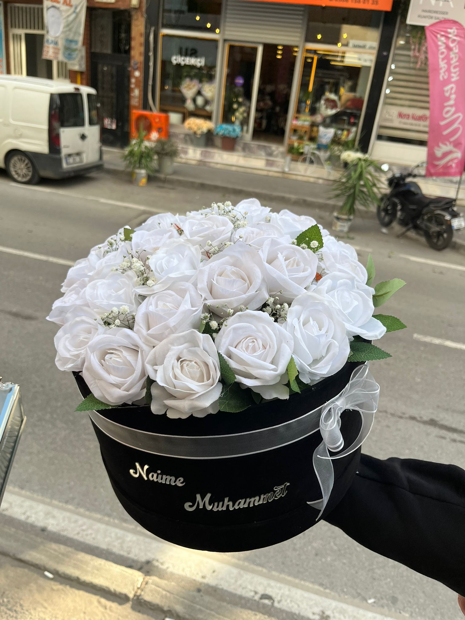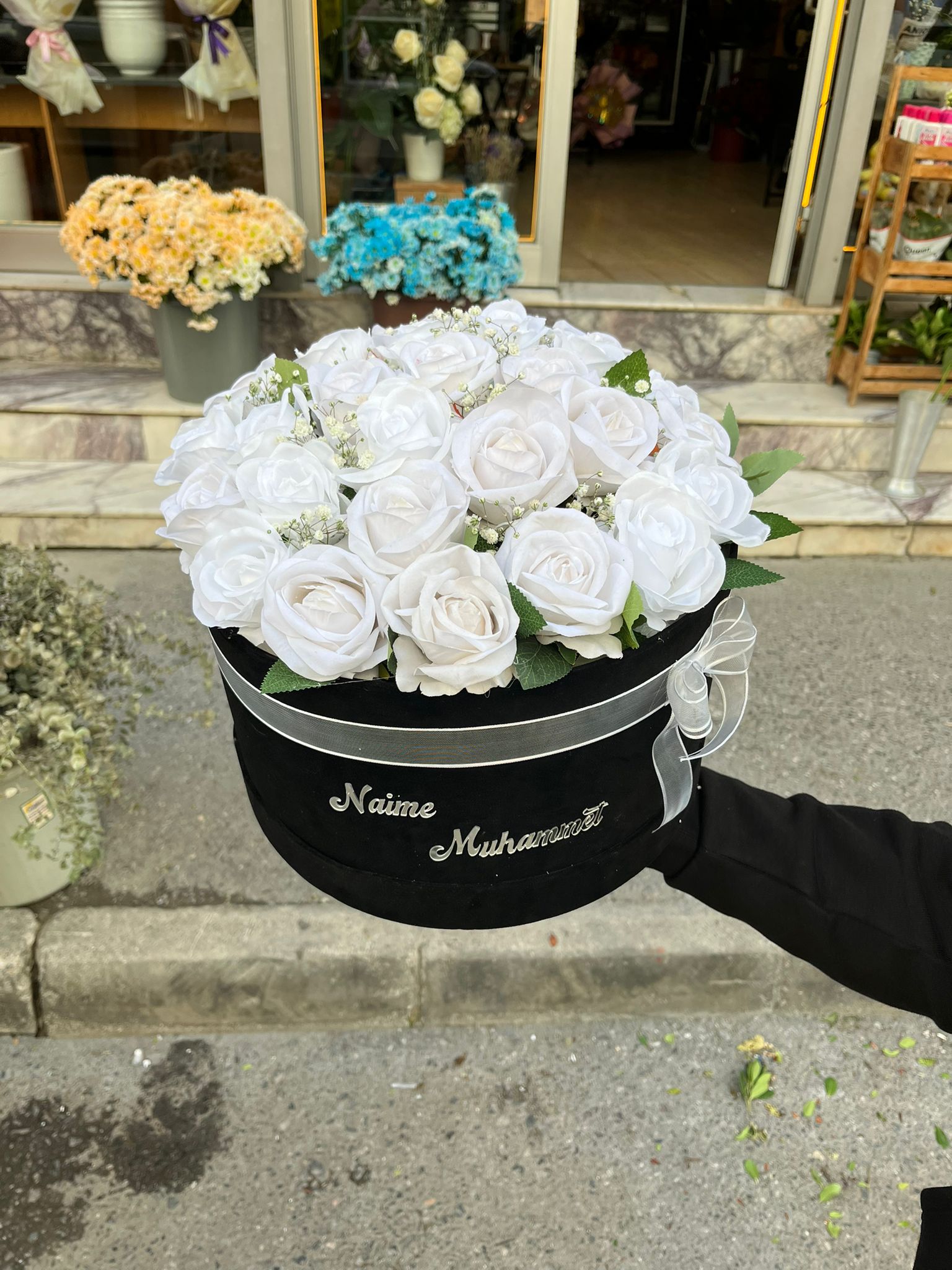 Kız istemelerde popüler olan siyah kadife kutuda 30 adet beyaz yapay kadife gül kullanımı ile aranjman oluşturulmuştur.İsteğe göre kutunun üzerine damat ve gelin adayının isimleri pleksi yazı ile eklenmektedir.Yazıların renk seçenekleri gold veya silver olarak seçebilirsiniz.