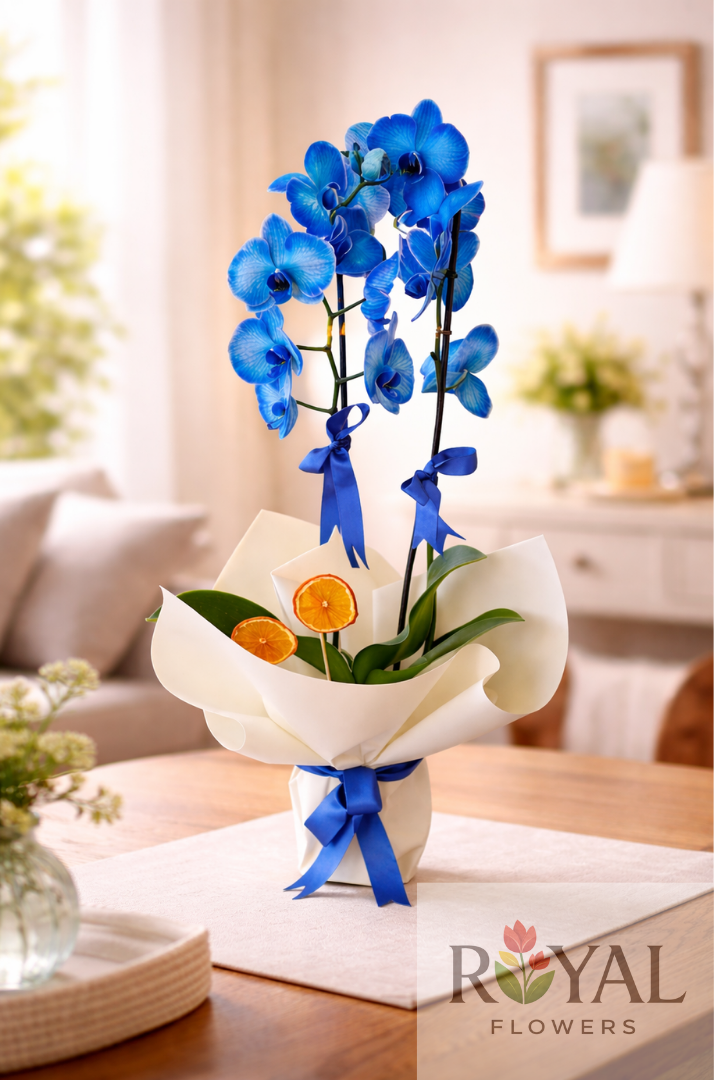 Göz alıcı rengi ve dolgun yapısıyla öne çıkan çift dal mavi orkide 💙