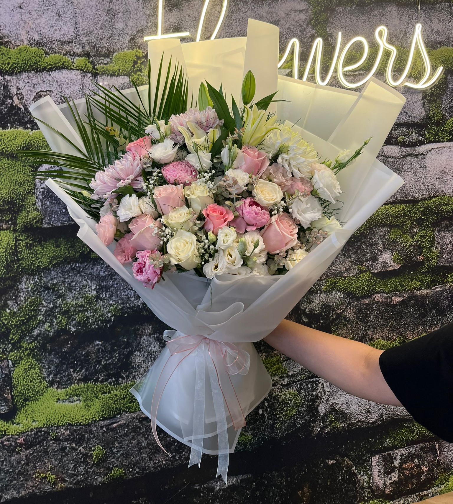 Mega boy olan buket içerisinde şakayık anastasia pemve beyaz tonalrında ithal güllerden oluşmuştur. Tamamen ithal çiçeklerden oluşan şık tasarım buketi