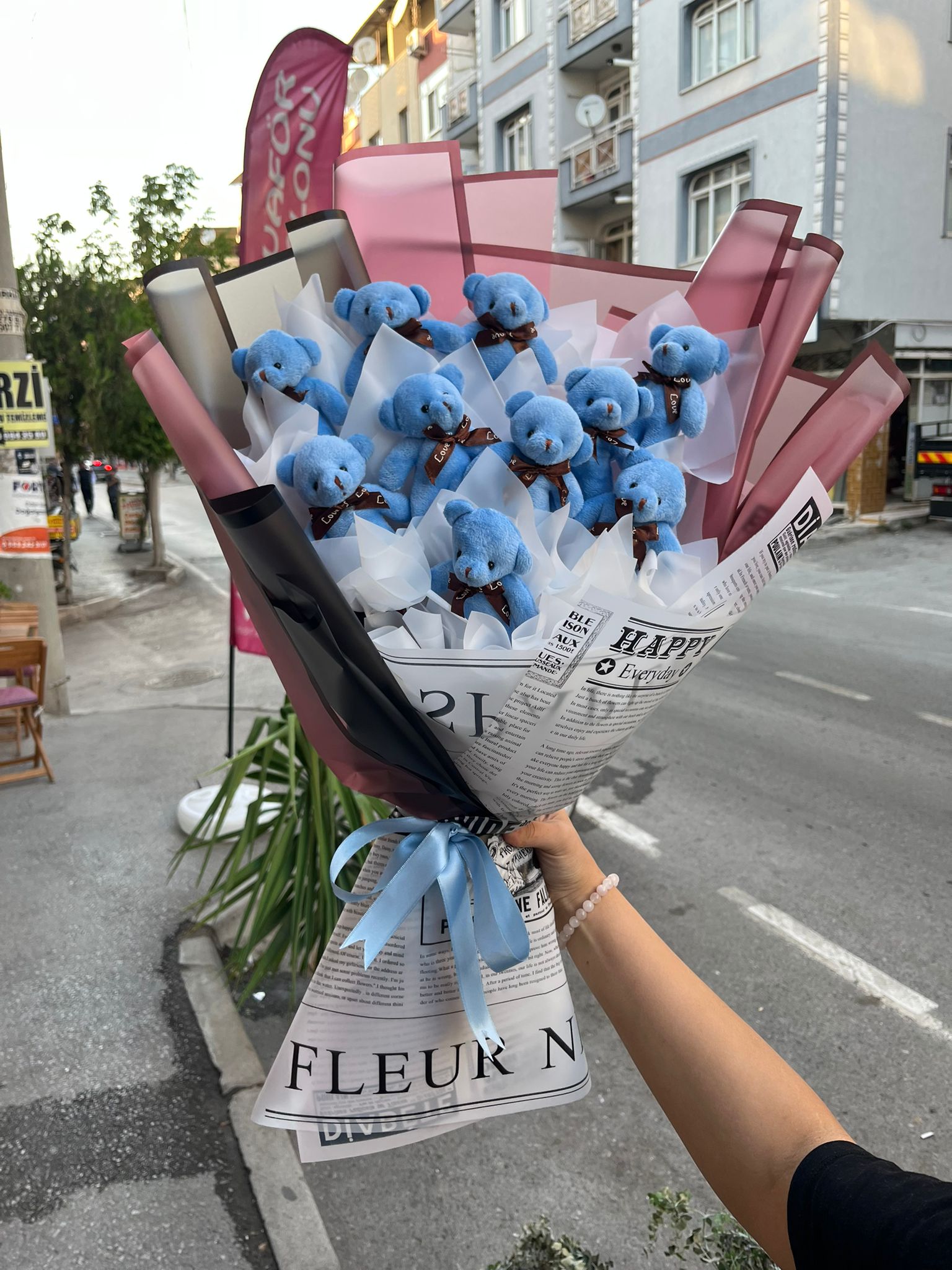 Mavi peluş ayıcık buketi, 9 adet peluş oyuncak ayıcık ile hazırlanmıştır. Gazete desenli özel ambalajı, beyaz tül detayları ve mavi kurdele süslemesiyle şık bir görünüm kazanmıştır.
