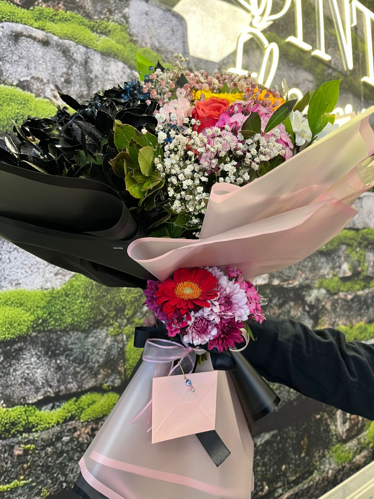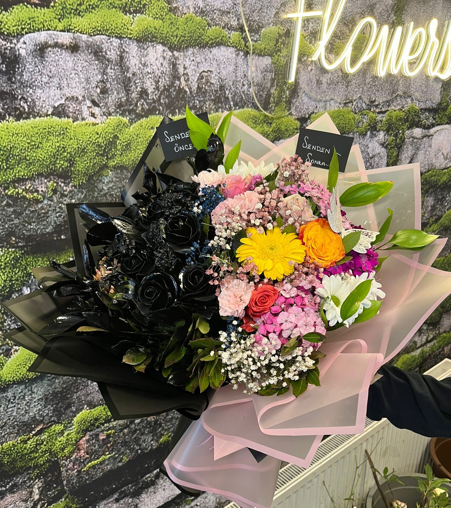Büyük boy “Senden Önce Senden Sonra” buketi, yarısı siyah kadife güller, diğer yarısı ise canlı renkli güller ve çeşitli çiçeklerle hazırlanmış cesur ve dikkat çekici bir tasarımdır. Farklılık arayanlar için mükemmel bir seçenek olan bu buket, romantizmi, şıklığı ve modern çiçek tasarımını bir araya getirir. Siyah güllerin gizemli dokusu ile renkli çiçeklerin enerjisi, özel anlarınızı unutulmaz kılar. Doğum günü, yıl dönümü veya özel sürprizler için trend ve çarpıcı bir hediye alternatifi sunar. 🌈🖤