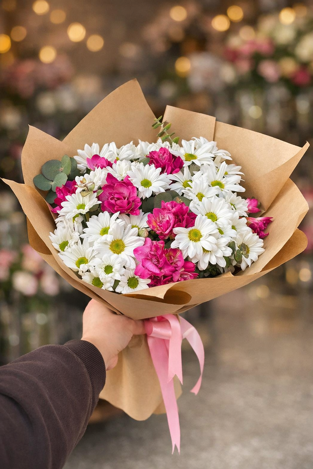 🌿 Kraft kağıda özenle sarılmış, beyaz papatyaların saflığı ve pembe frezyaların hoş kokusuyla hazırlanan bu özel buket; sadeliği ve zarafeti bir arada sunar. Doğal görünümüyle dikkat çeken bu aranjman, hem romantik hem de içten bir hediye arayanlar için mükemmel bir tercihtir.