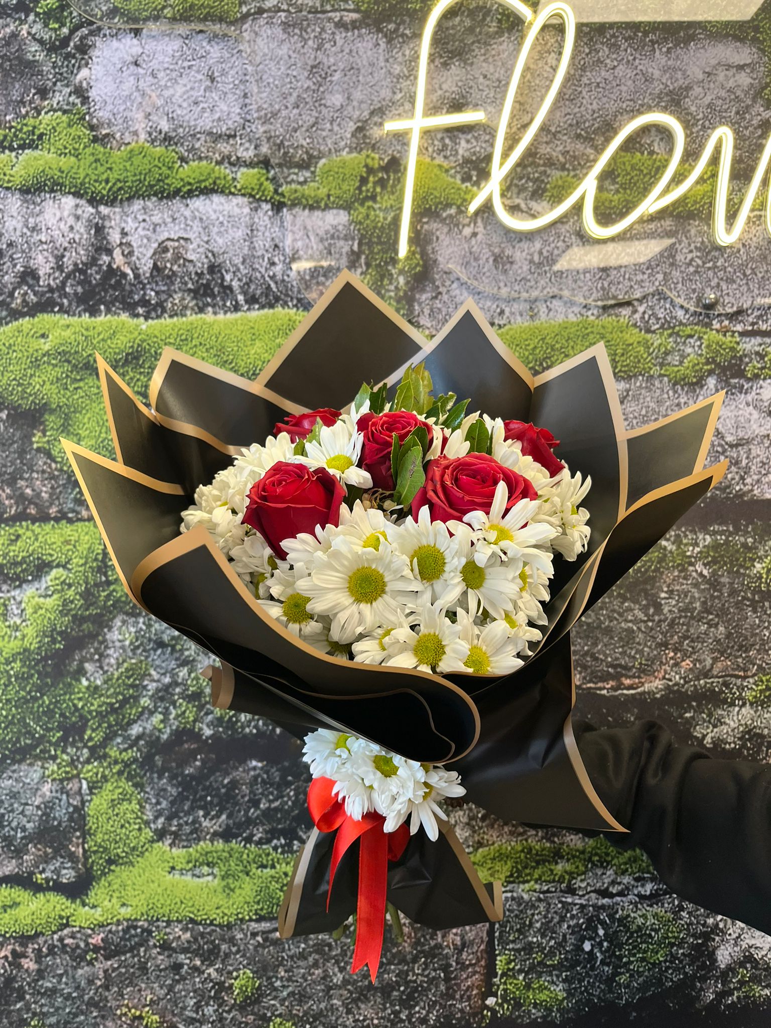 Siyah Ambalajda Beyaz Papatya ve Kırmızı Gül Buketi ❤️