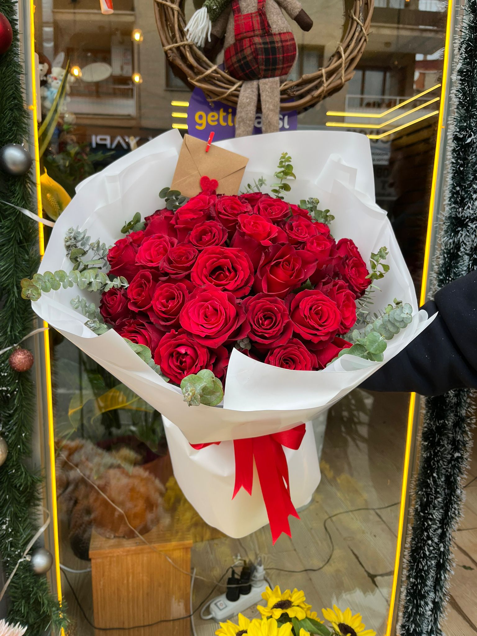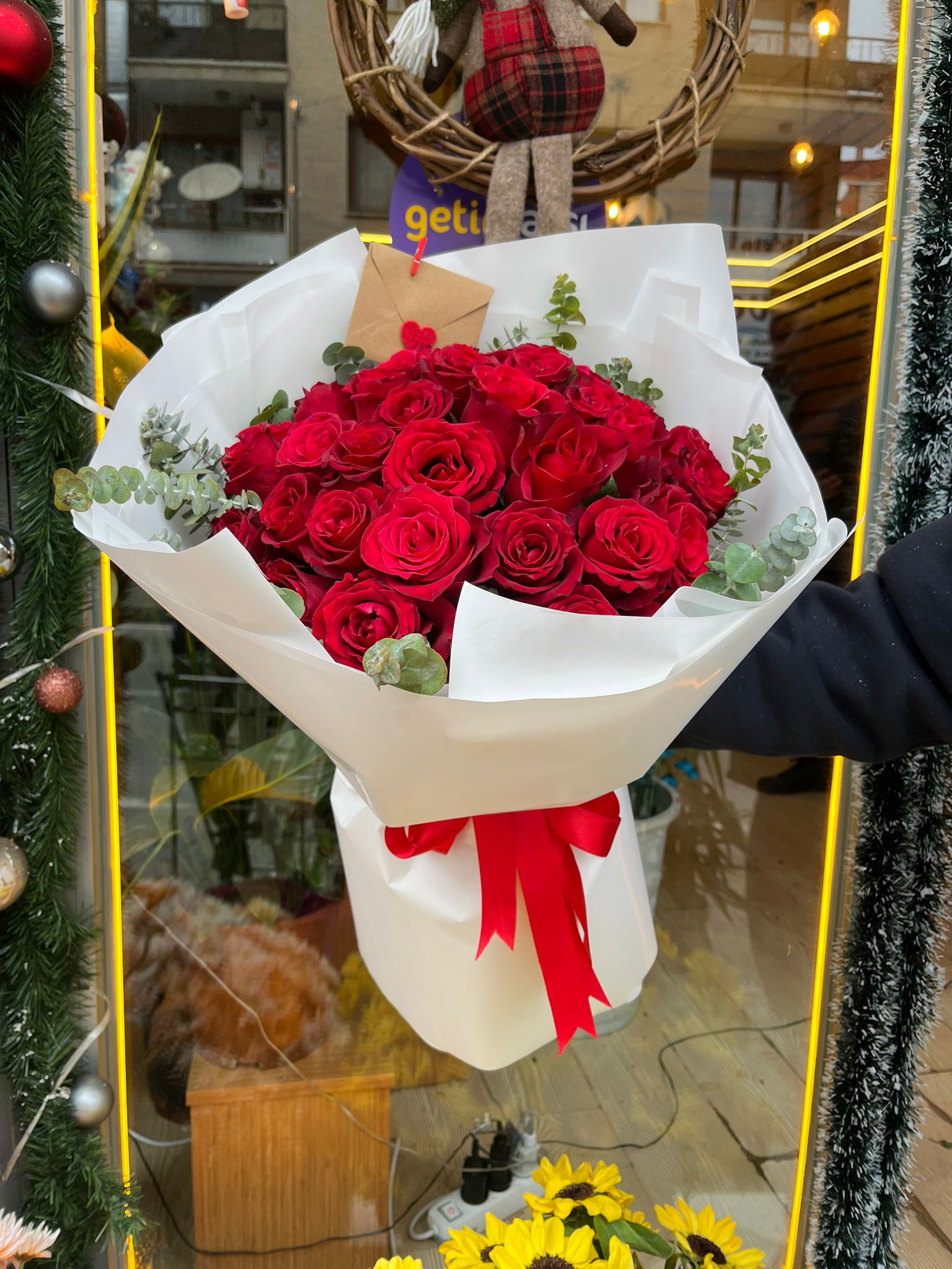 Yoğun çiçek ve sade soft tasarımlar için tasarlamış olduğımuz 41 li kırmızı gül buketimiz