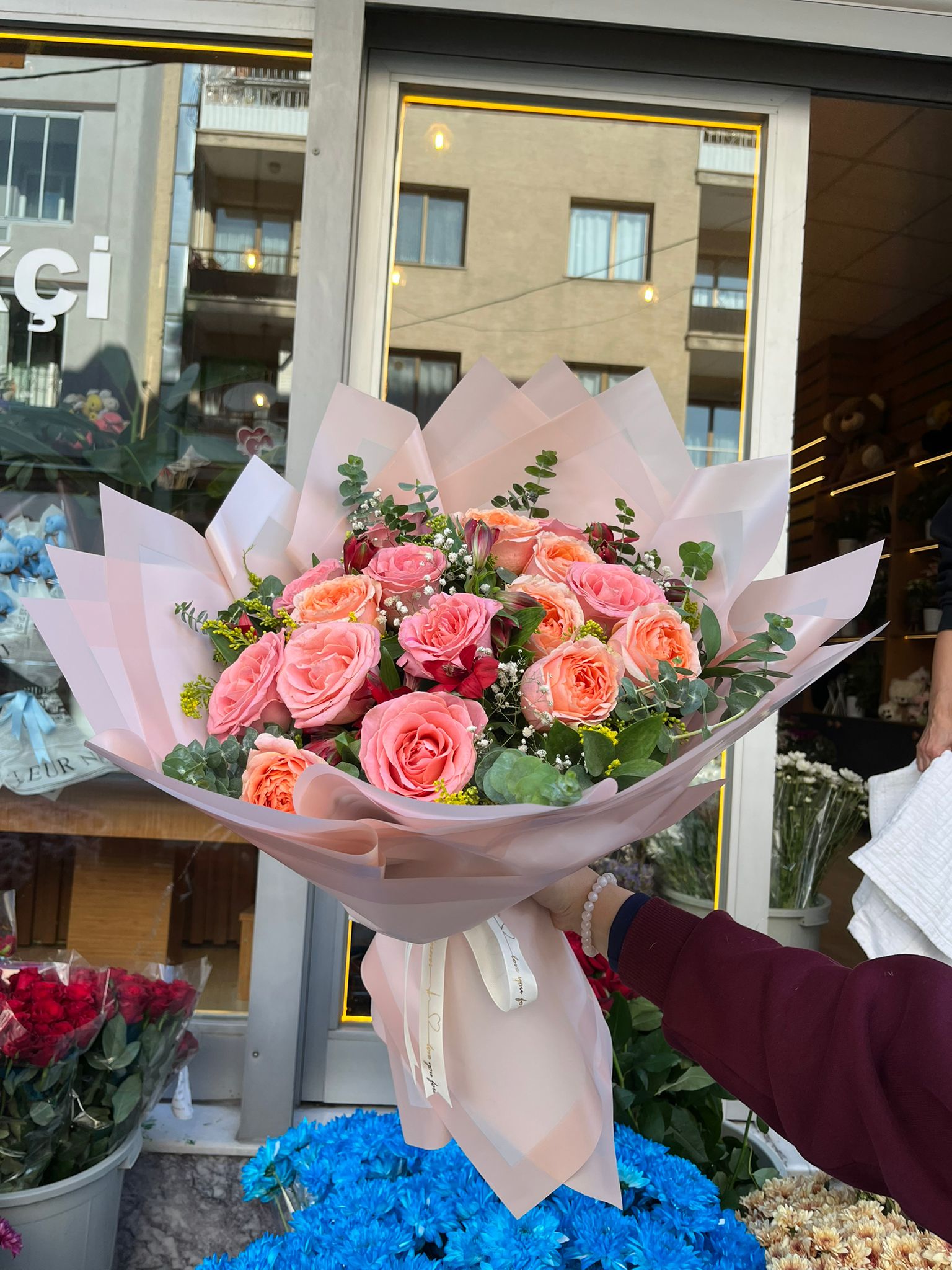 Soft tonlarda hazırlanmış bu büyüleyici buket, ithal pembe ve somon güllerin zarafetini Asomeria çiçeğinin asaletiyle birleştiriyor. 🌷✨ İçerisindeki okaliptus yaprakları tazelik katarken, solidago çiçekleri doğal bir ışıltı yaratıyor. Büyük boy tasarımıyla dikkat çeken bu buket; zarif, modern ve romantik görünümüyle her özel ana anlam katar. 💖 Sevgililer Günü, doğum günü ya da özel kutlamalar için hem şık hem de unutulmaz bir hediye seçeneğidir. 🌿🌸